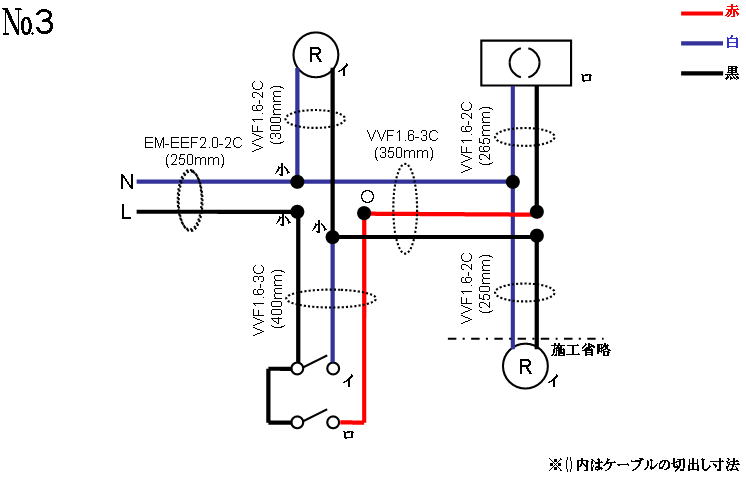 埋込形器具(単極スイッチ2個)の渡り配線も複線図を書いてみると意外なほど簡単だと思います。